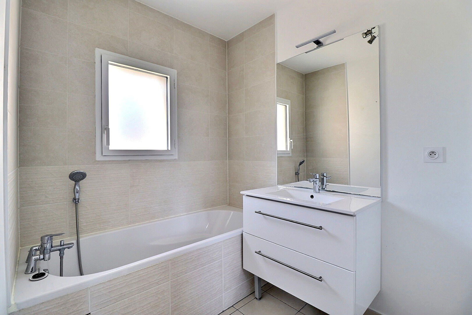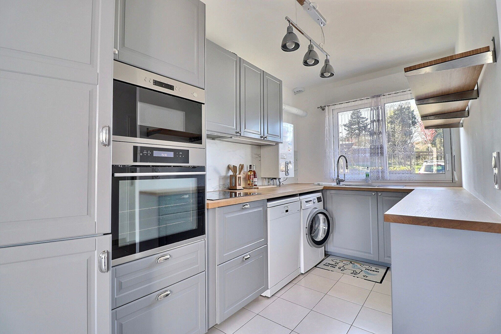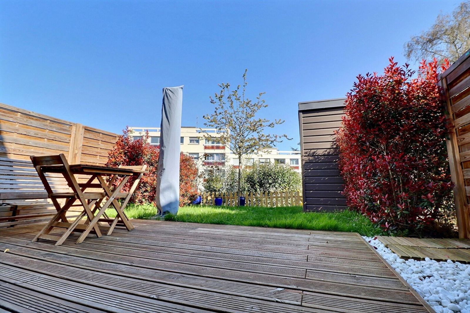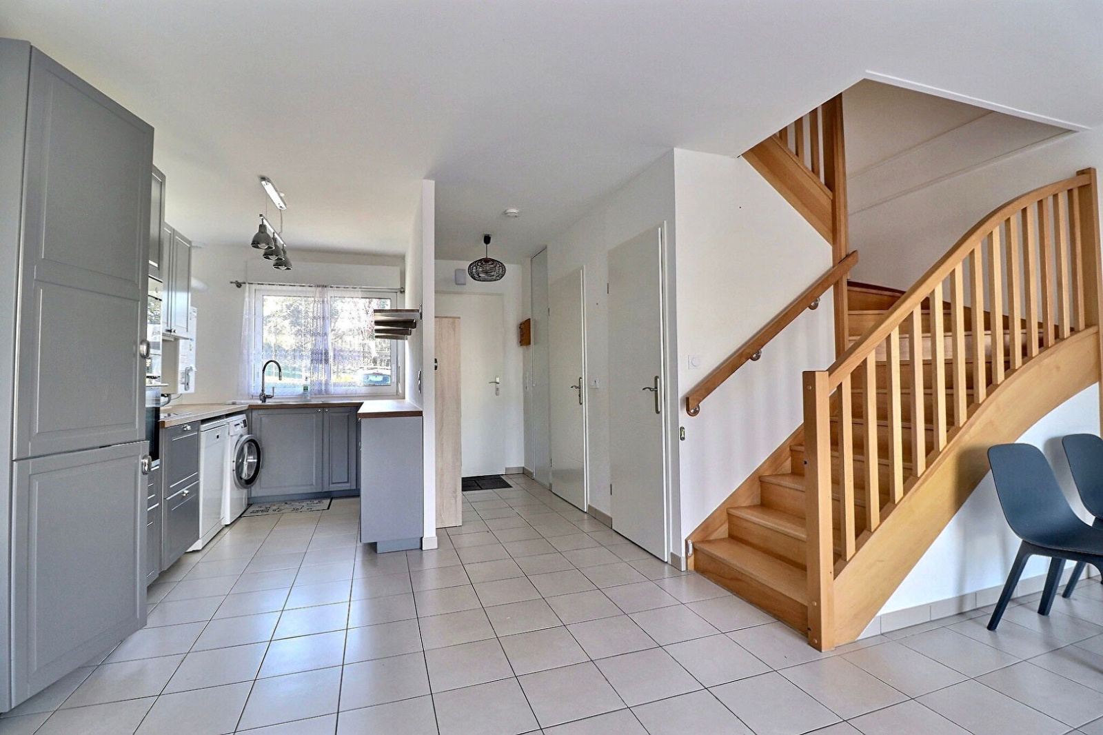 Entrée avec placard, séjour de 35m² environ ouvert sur terrasse et jardin, cuisine équipée, grande salle de douche avec wc.