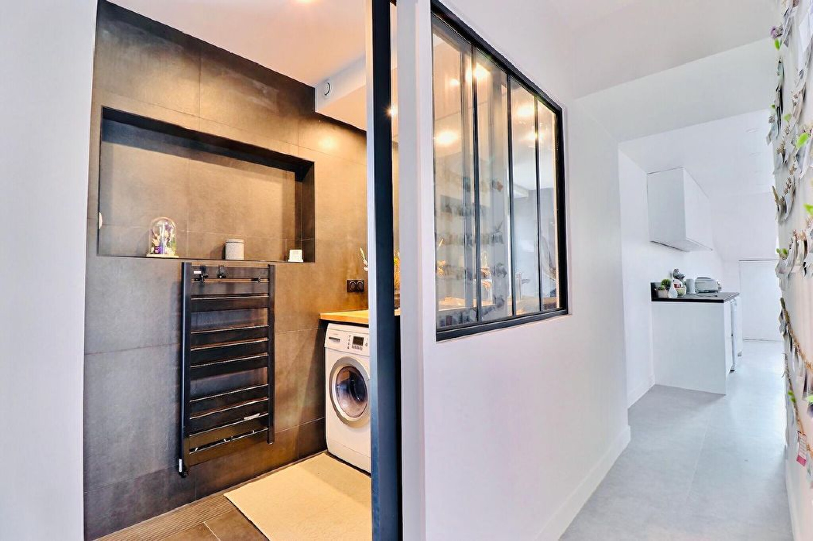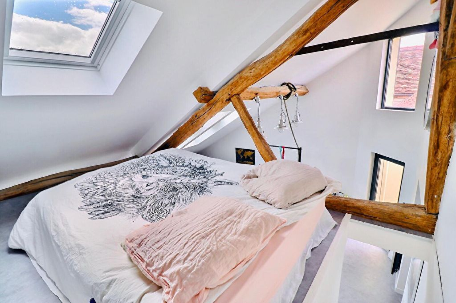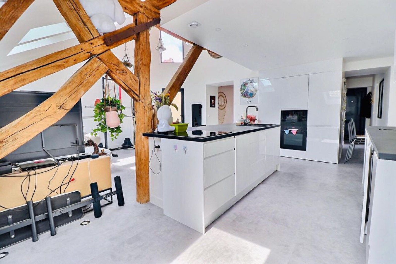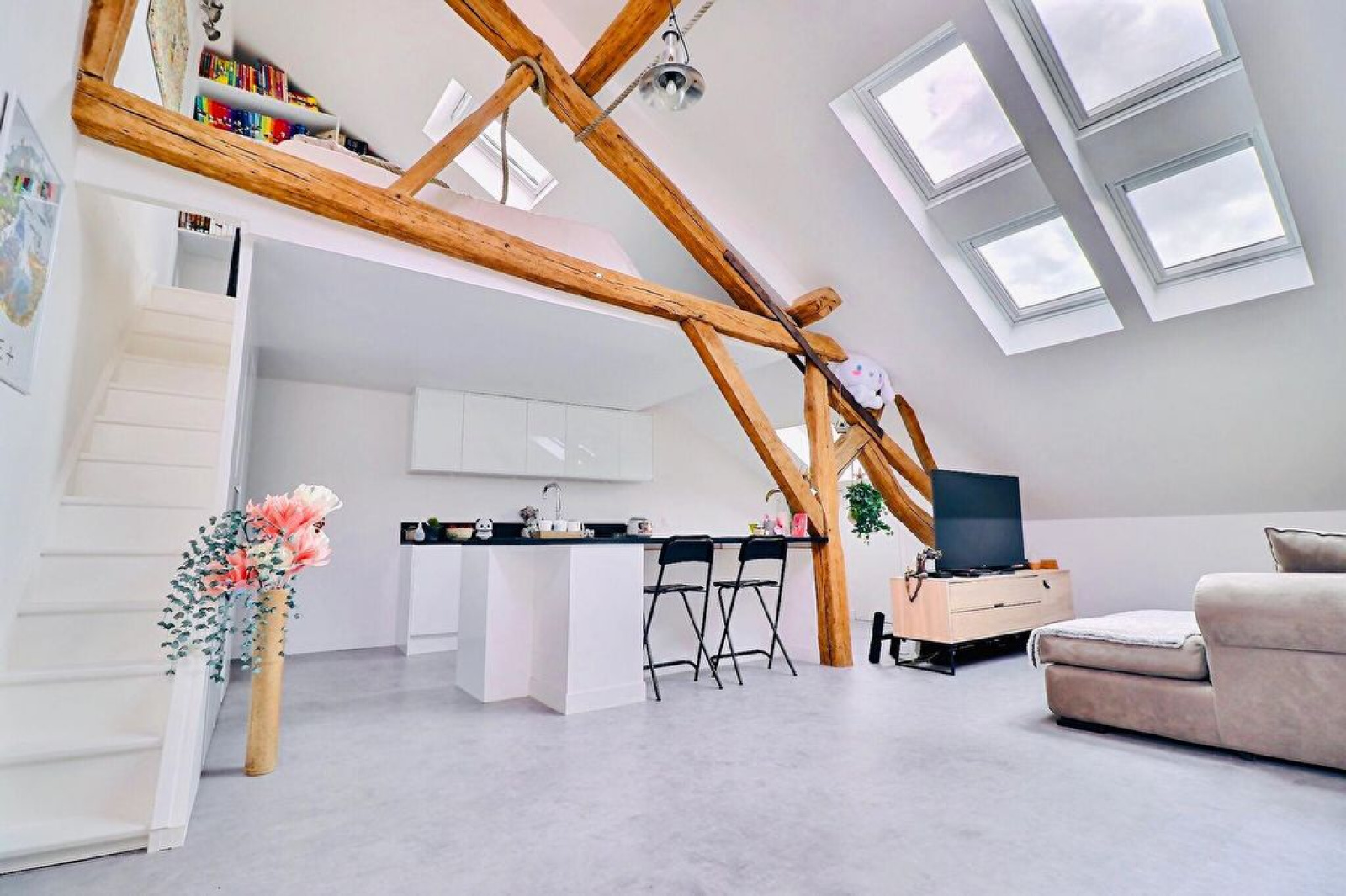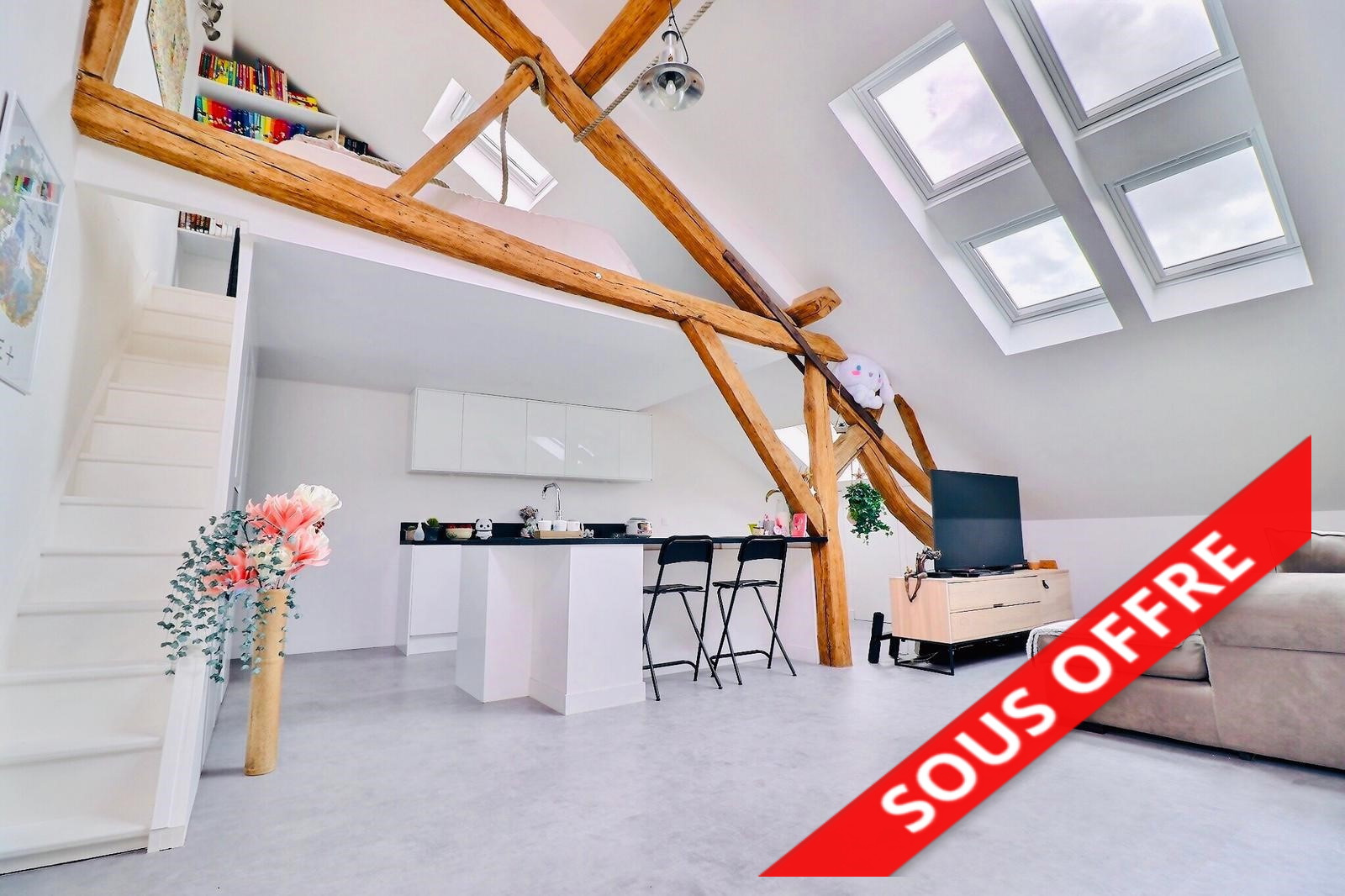 Entrée, séjour cathédral avec mezzanine sud-ouest, cuisine US équipée, chambre avec placard, salle de douches avec buanderie.