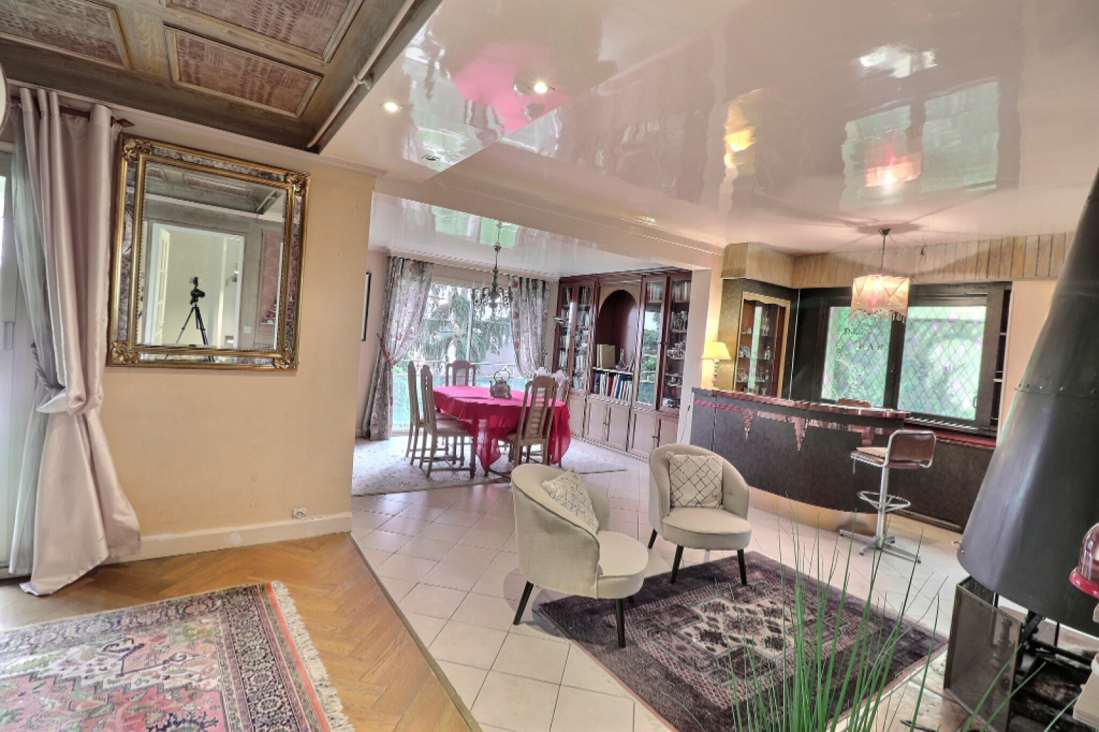 Entrée, grand séjour avec cheminée de 44m² sur terrasse, cuisine, bureau, 4 chambres possibles, SDD, 2 SDB, 3 WC,