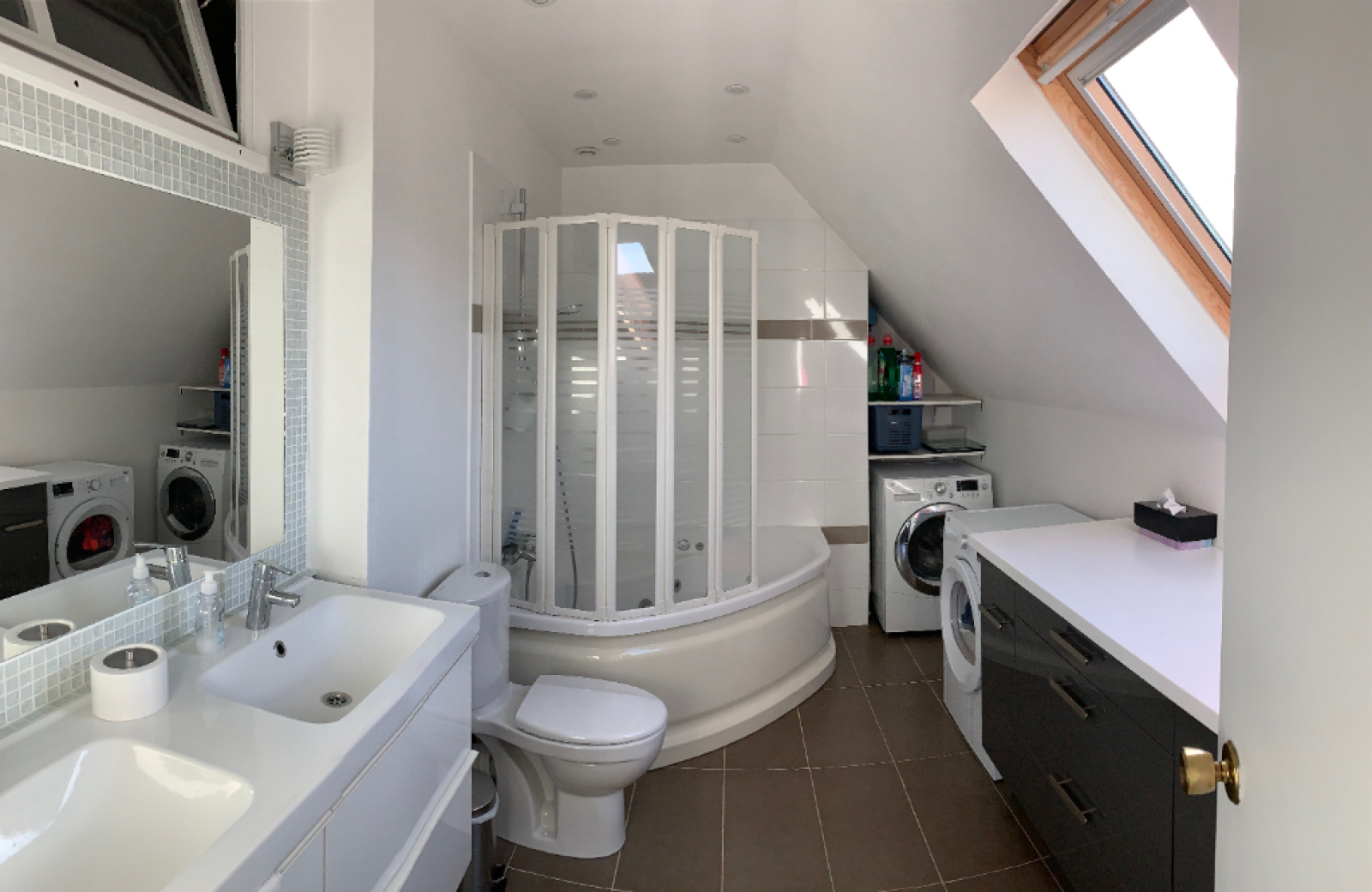 Combles : grande pièce palière, chambre. Chauffage électrique.