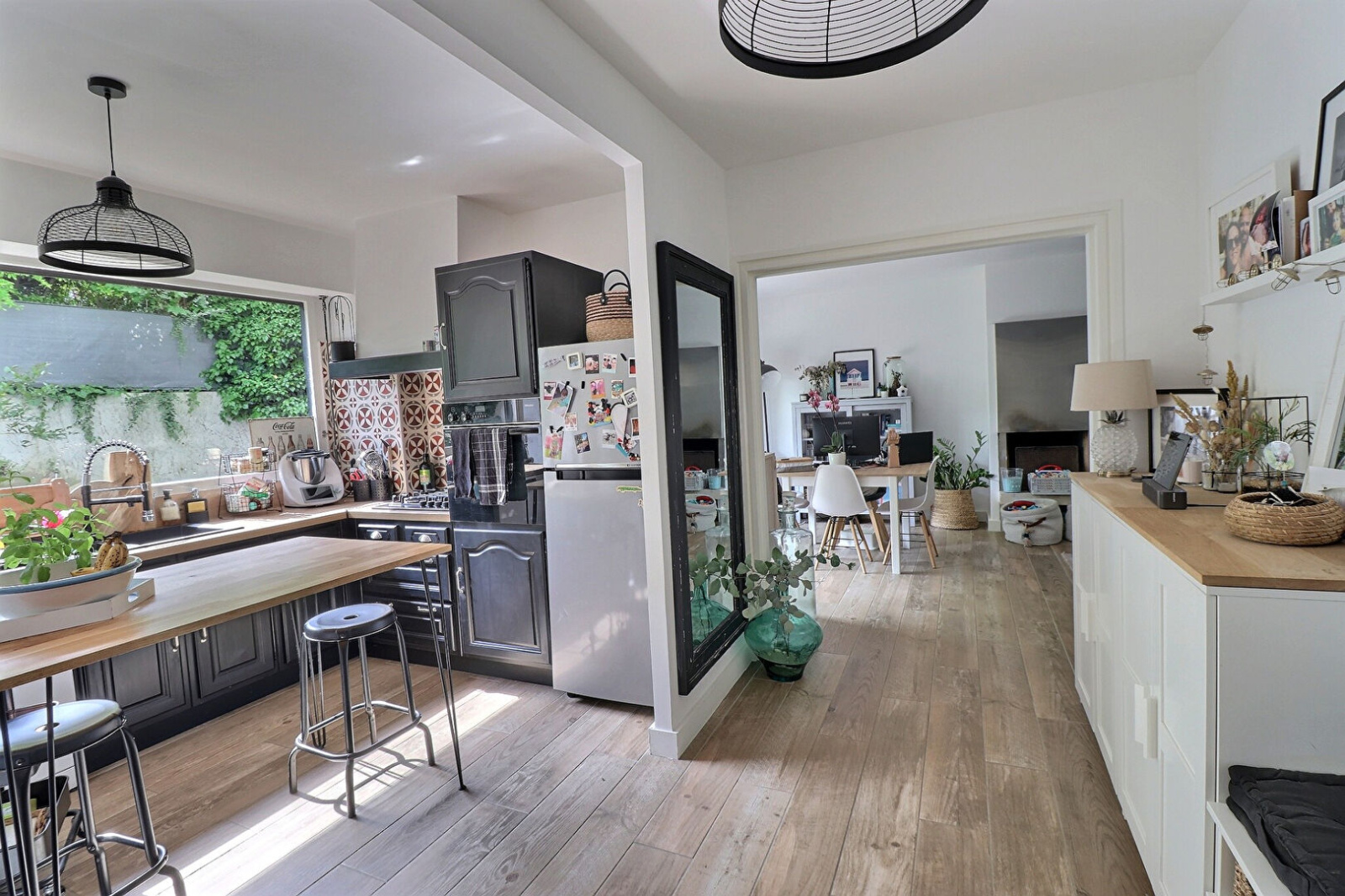 Cuisine américaine et salon avec cheminée sur jardin exposé sud-est, ,dégagement avec placards, wc, 2 chambres avec placards sur jardin, nord ouest, salle de bains avec espace buanderie.