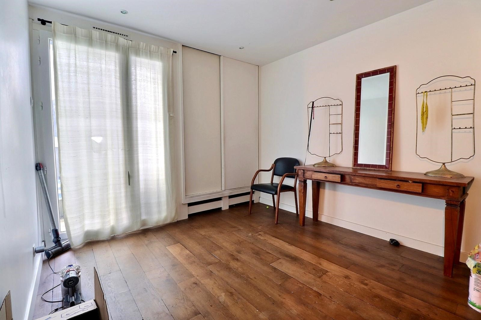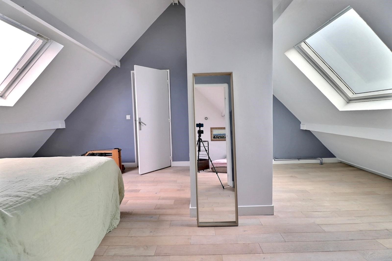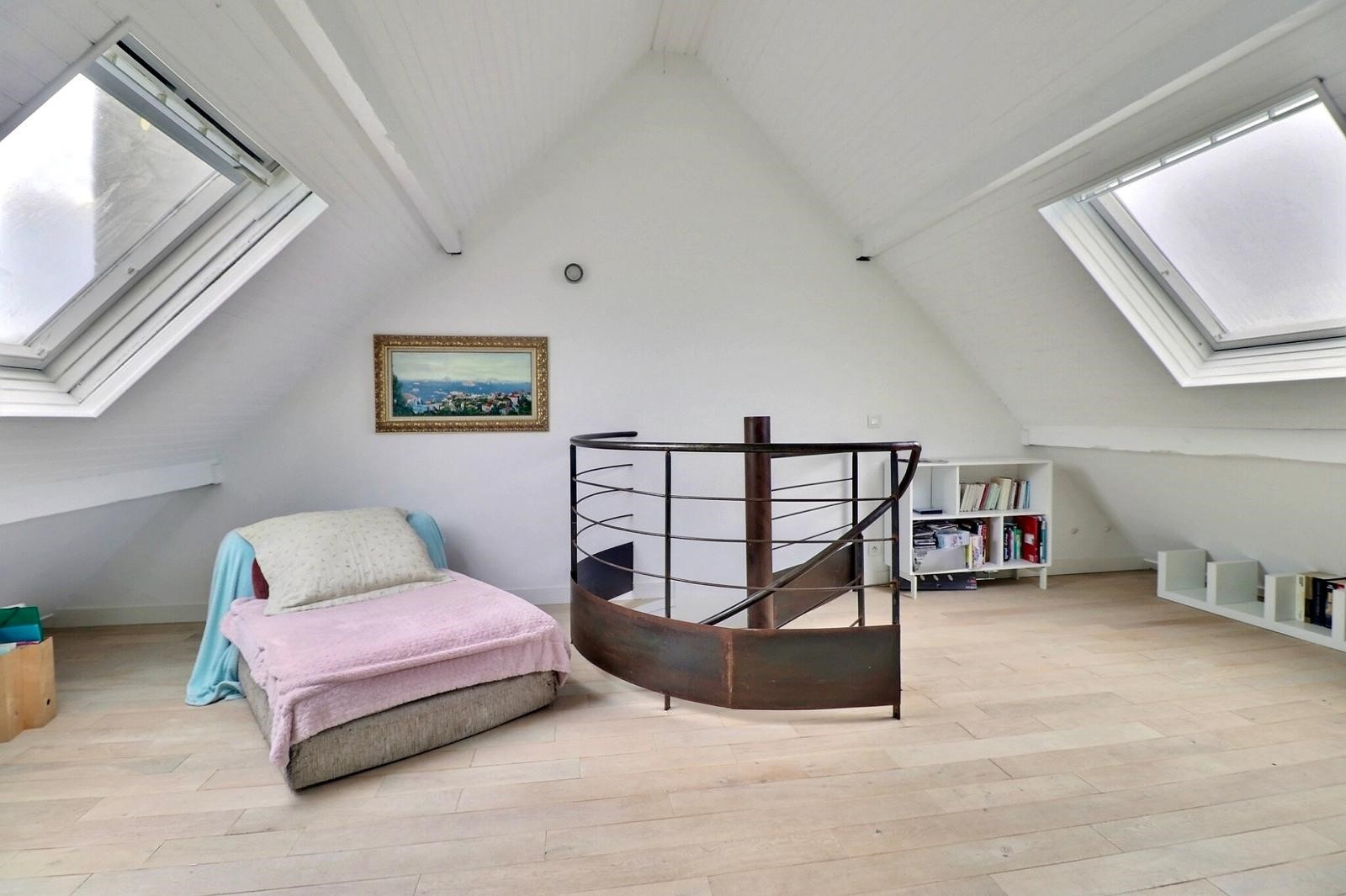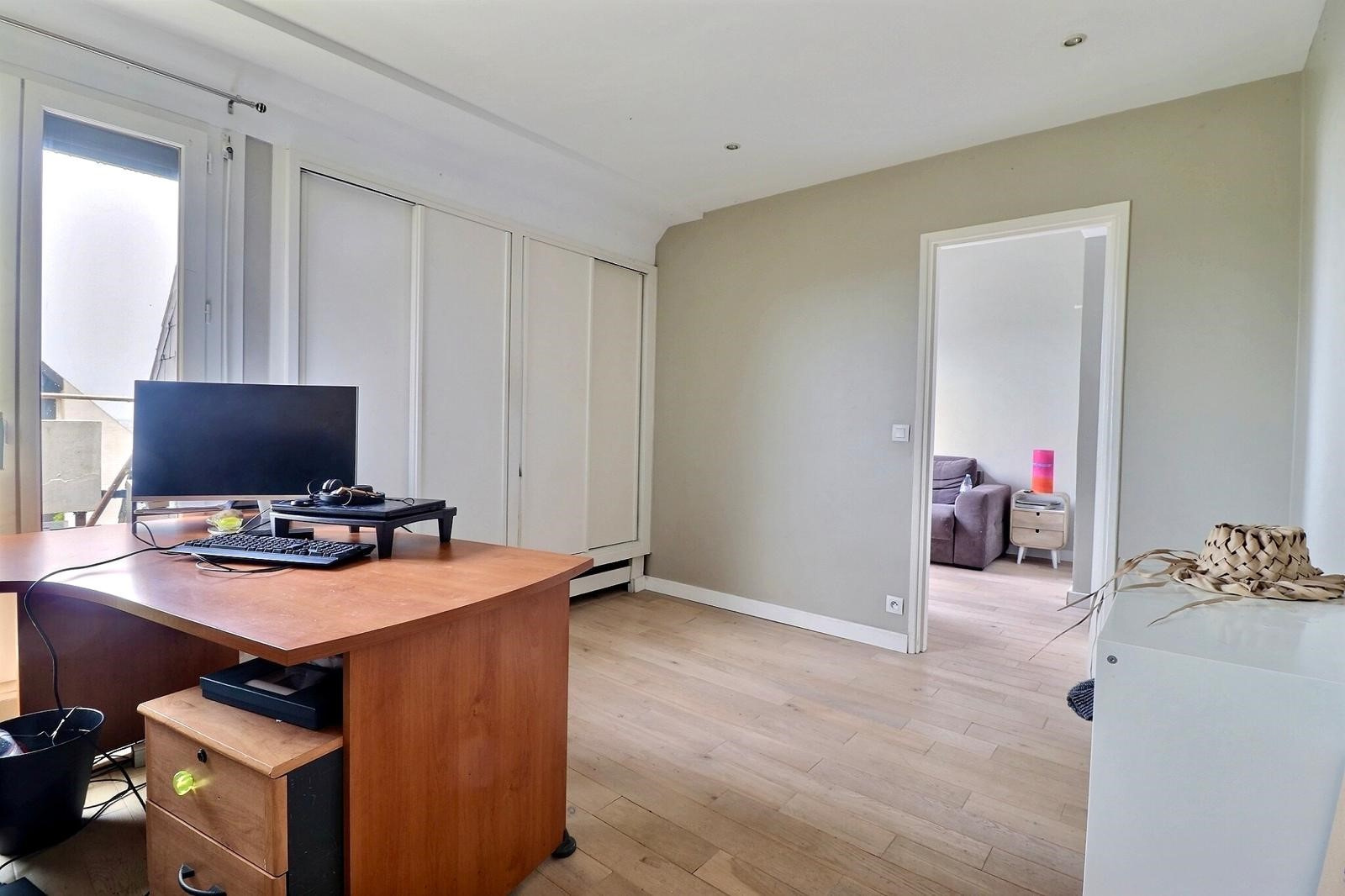 Dans les combles : chambre avec coin bureau.